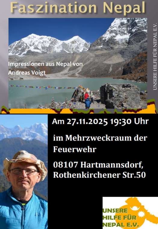 In knapp einem Monat, kurz vor dem ersten Advent läd unser Vereinsvorsitender Andreas Voigt zu einem Vortrag nach Hartmannsdorf an. Am Donnerstag, den 27. November 2025, 19:30 Uhr geht es um die Fasziantion Nepal. Neben vielen Bilder der herrlichen Bergwelt Nepals geht es auch um Land und Leute.